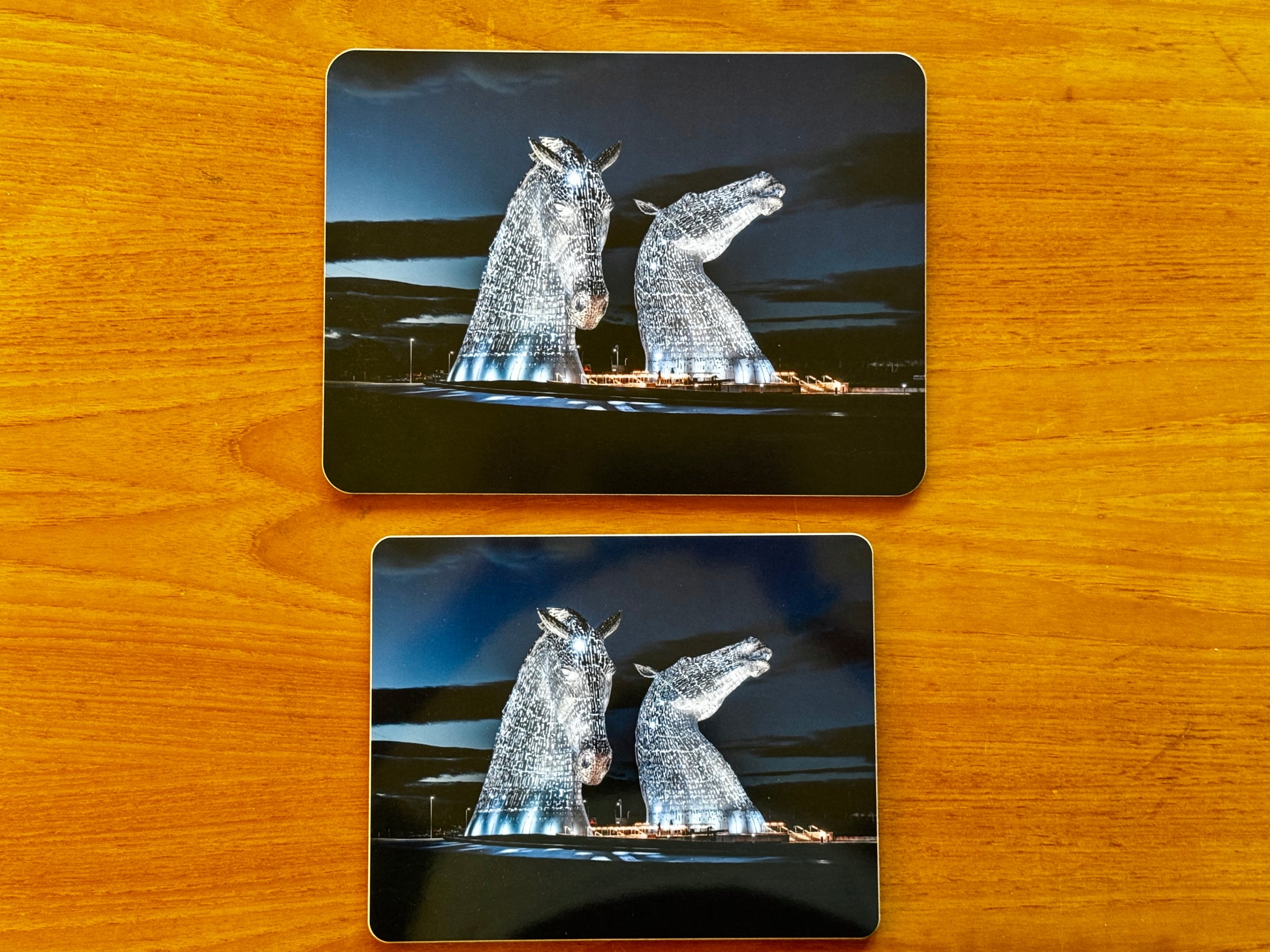 A low-light photo of the famous Kelpies is printed on a high-quality and durable melamine, and comes with Cork backing as shown in the images.